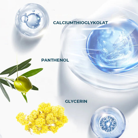 INHALTSSTOFFE: Calciumthioglykolat ist eine Chemikalie, die die Proteinstruktur der Haare auflöst und so die Entfernung erleichtert. Es ist eine sanfte Alternative zu herkömmlichen Haarentfernungsmethoden wie Rasieren oder Wachsen, die zu Hautreizungen, Beulen und eingewachsenen Haaren führen können.